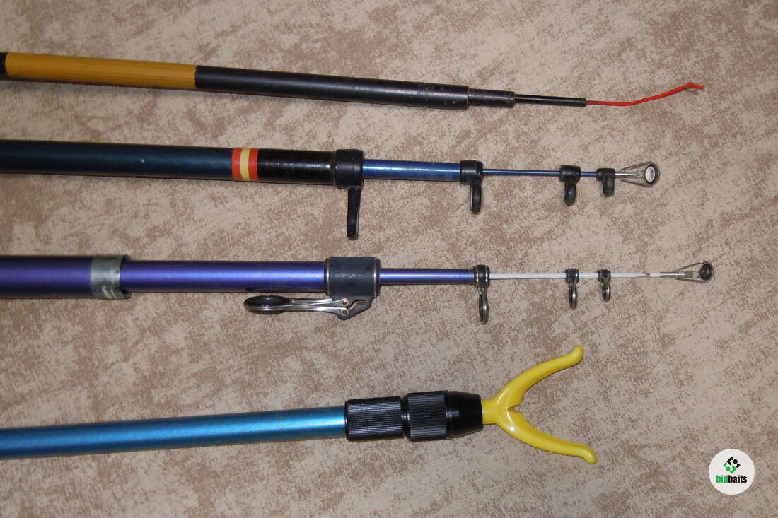 1)маховое удилище из японии Daiwa (очень древнее) рост 3.6м, в сложенно виде 1м вес 125гр 4 колена (много царапин и потертостей, загрязнения, ручка замотана скотчем)