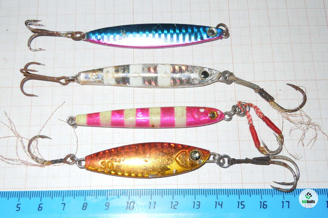№7 набор пилькеров из Японии (веса 28гр+ 30гр+30гр+32гр) (потертости,сколы краски, окислы, ржа на крючках)