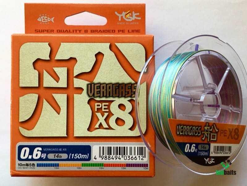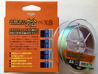 YGK Veragass X8 - восьмижильный шнур с отличными рабочими характеристиками. Он изготовлен из качественных японских полимеров. Серия очень универсальна - Veragass X8 может использоваться в любой разновидности спиннинговой рыбалки, а также для морской ловли. Шнур очень прочный и устойчивый к разрыву. Благодаря специальной пропитке, плетенка получила отличную гладкость, позволяющую ей с легкостью скользить сквозь кольца. На дальность заброса также хорошо влияет плотное плетение шнура, делающее его сечение максимально круглым. Плетенка легко наматывается на шпулю. Многоцветная окраска шнура позволяет отслеживать размотку лески и контролировать проводку.