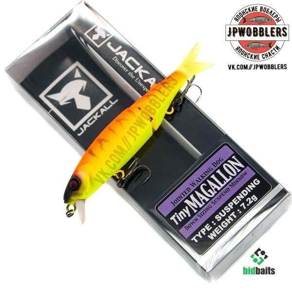 Воблер серии Tiny Magallon от торговой марки Jackall представляет собой компактную версию популярной модели Magallon. Это двухсоставной воблер типа минноу, его рабочий горизонт находится в пределах от 0,5 до 0,8 м. Тип плавучести этой приманки - suspending, поэтому воблер может долгое время зависать в толще воды. Подвижный силиконовый хвостик добавляет приманке сходства с настоящей рыбкой, дополнительно провоцируя хищника. Tiny Magallon выпускается как в натуральных, так и в кислотных расцветках. Оснащается воблер парой тройных крючков. Приманка от Jackall подходит для ловли окуней, жерехов, голавлей, щук и прочих крупных хищников. Наиболее эффективной проводкой будет равномерка или твичинг.