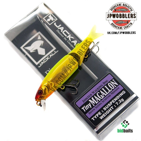 Воблер серии Tiny Magallon от торговой марки Jackall представляет собой компактную версию популярной модели Magallon. Это двухсоставной воблер типа минноу, его рабочий горизонт находится в пределах от 0,5 до 0,8 м. Тип плавучести этой приманки - suspending, поэтому воблер может долгое время зависать в толще воды. Подвижный силиконовый хвостик добавляет приманке сходства с настоящей рыбкой, дополнительно провоцируя хищника. Tiny Magallon выпускается как в натуральных, так и в кислотных расцветках. Оснащается воблер парой тройных крючков. Приманка от Jackall подходит для ловли окуней, жерехов, голавлей, щук и прочих крупных хищников. Наиболее эффективной проводкой будет равномерка или твичинг.