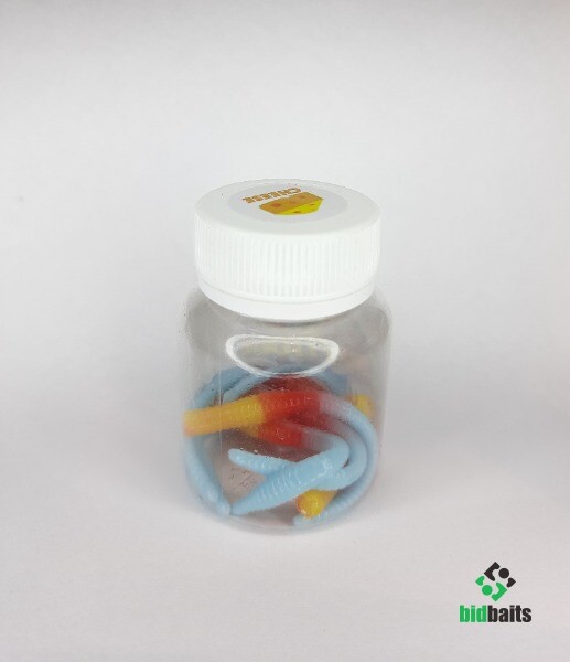 Приманки упакованы в пластиковые баночки, которые хорошо сохраняют их "съедобные" свойства.