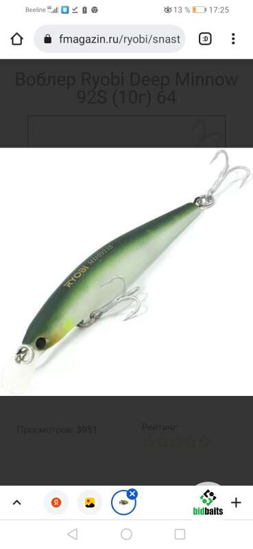 Производитель: Ryobi Deep Minnow 92F - классический воблер-минноу с прогонистой формой тела. Он имеет положительную степень плавучести и рабочий горизонт, достигающий 1,3 м. Это отличная приманка для ловли щуки на неглубоких участках, а также над травой в заросших местах. Хорошо подходит для ловли судака. Воблер своей активной уверенной игрой приманивает даже пассивного хищника. В корпусе Deep Minnow имеется “погремушка”. Стук металлических шариков выманивает рыбу из засады, а также помогает ей быстрее найти раздражитель при плохой видимости или с большого расстояния. Deep Minnow хорошо твичится. Его можно провести и классической равномеркой с паузами.