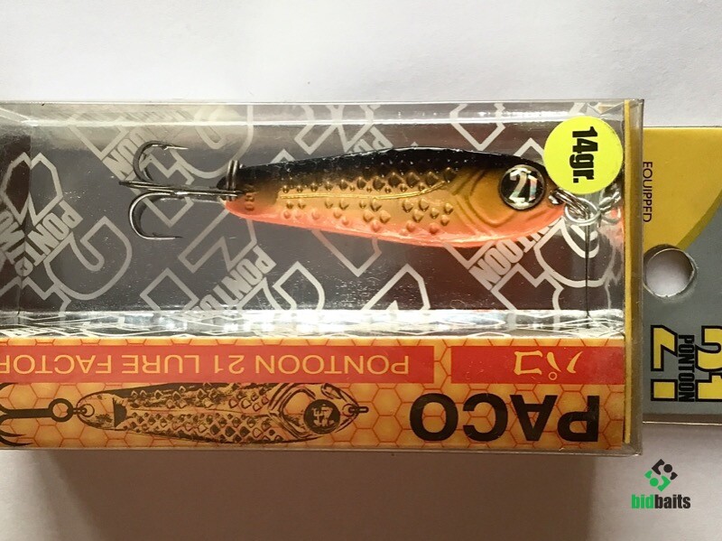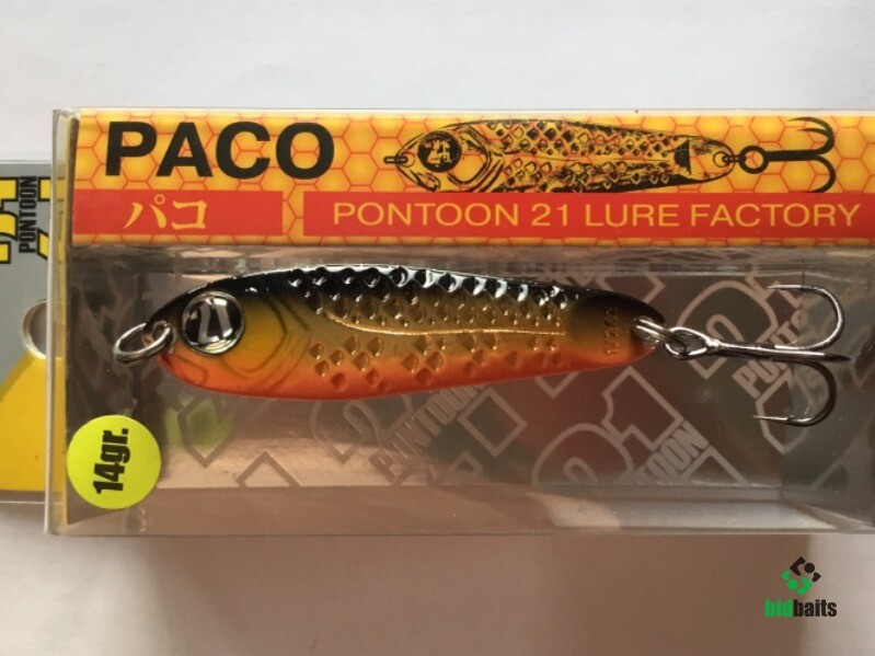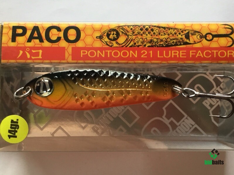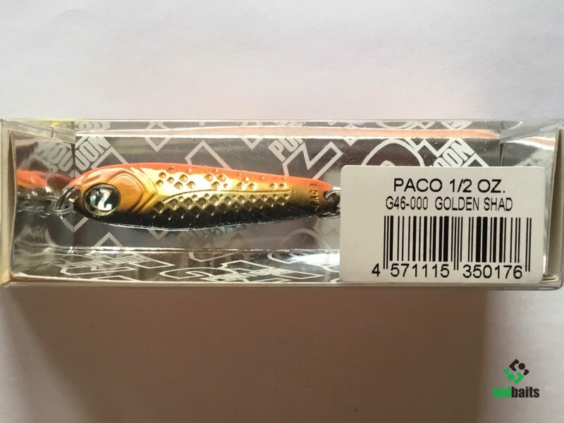 Выпускается в трех размерах: Paco 11 (3/8 oz — длина 48 мм, масса 10.5 г), Paco 14 (1/2 oz, длина 55 мм, масса 14 г), Paco 21 (длина 64 мм, масса 21 г). И в 11 вариантах уловистых расцветок, в основе которых — качественное гальваническое покрытие, поверх которого наносится многослойное лакокрасочное. Расцветки есть как максимально приближенные к живым прототипам — мелкой рыбешке, так и яркие, с «кислотными» тонами и UV-эффектом.