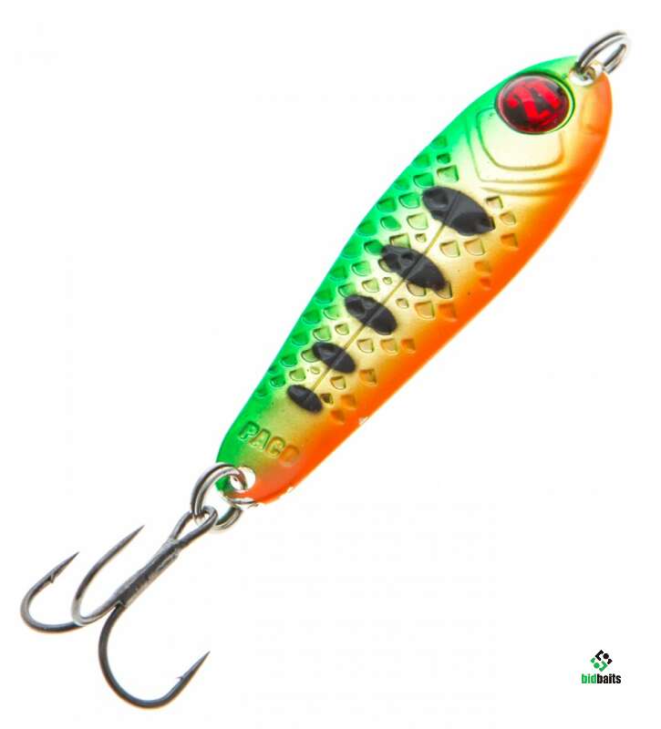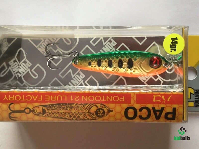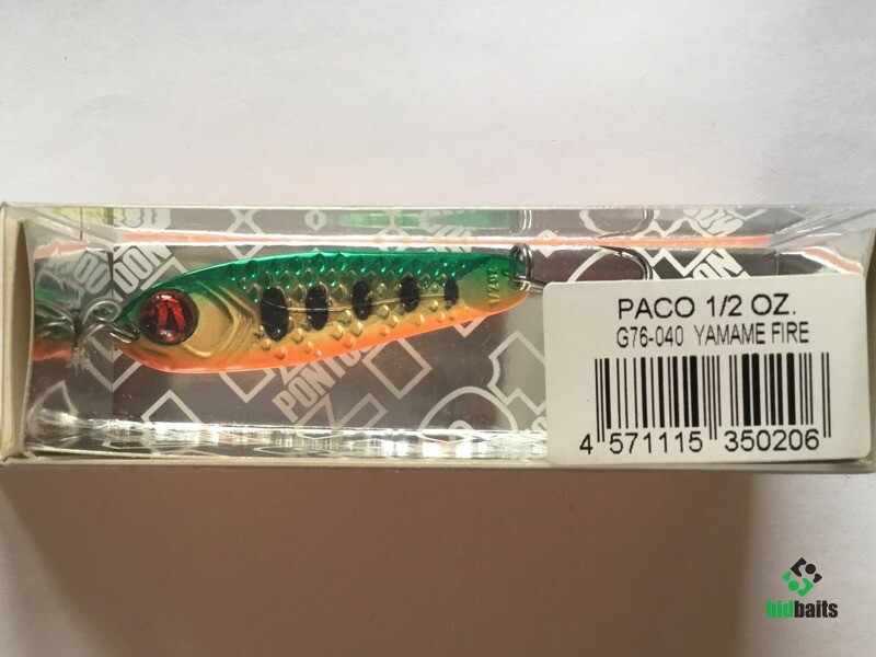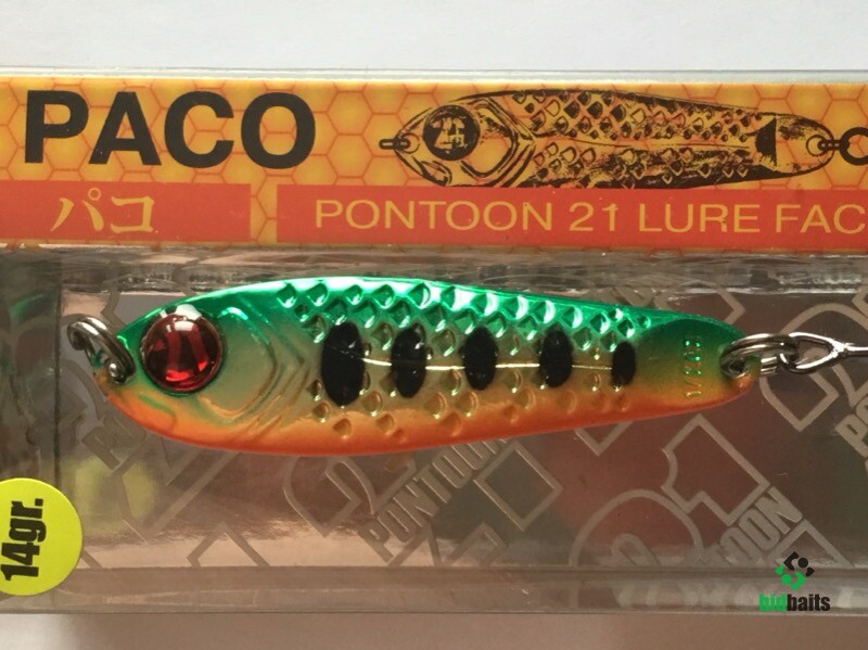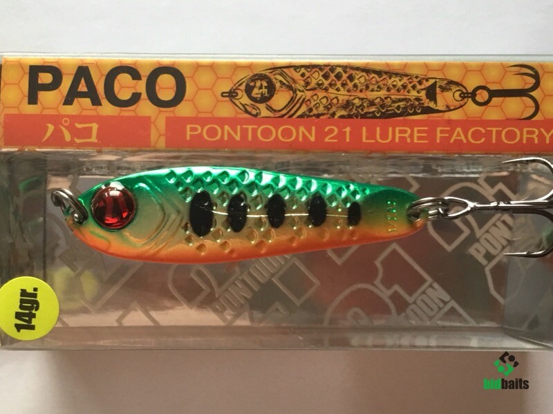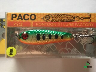 Выпускается в трех размерах: Paco 11 (3/8 oz — длина 48 мм, масса 10.5 г), Paco 14 (1/2 oz, длина 55 мм, масса 14 г), Paco 21 (длина 64 мм, масса 21 г). И в 11 вариантах уловистых расцветок, в основе которых — качественное гальваническое покрытие, поверх которого наносится многослойное лакокрасочное. Расцветки есть как максимально приближенные к живым прототипам — мелкой рыбешке, так и яркие, с «кислотными» тонами и UV-эффектом.