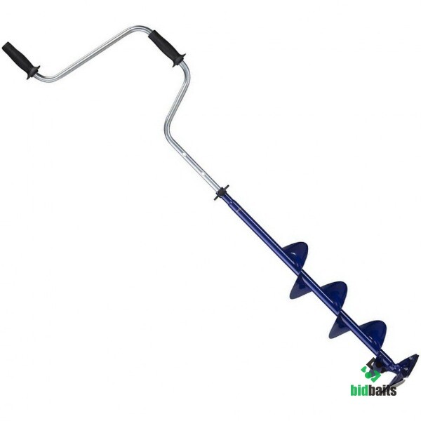 Верхняя рукоятка ледобура смещена относительно оси шнека на 130 мм, а нижняя на 150 мм. Такое расположение рукояток позволяет вращать ледобур одновременно двумя руками, тем самым, не прикладывая особых усилий, увеличивая скорость бурения лунок во льду.