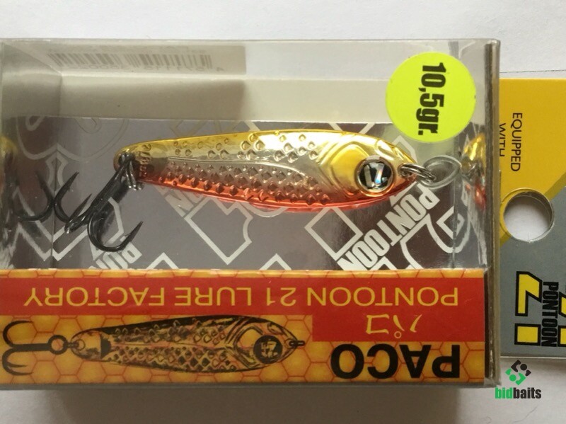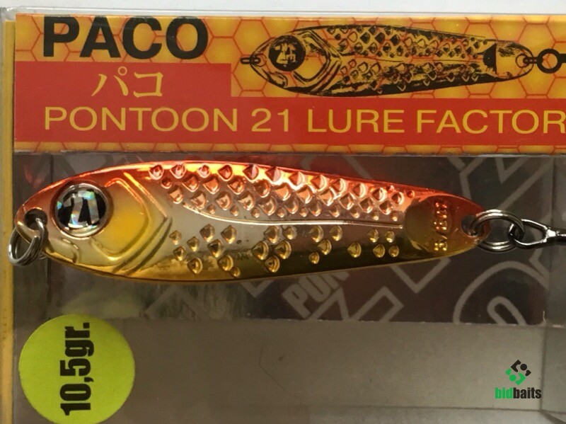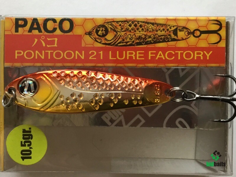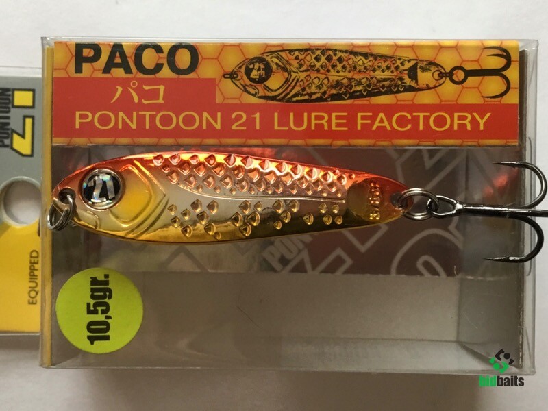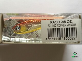 Выпускается в трех размерах: Paco 11 (3/8 oz — длина 48 мм, масса 10.5 г), Paco 14 (1/2 oz, длина 55 мм, масса 14 г), Paco 21 (длина 64 мм, масса 21 г). И в 11 вариантах уловистых расцветок, в основе которых — качественное гальваническое покрытие, поверх которого наносится многослойное лакокрасочное. Расцветки есть как максимально приближенные к живым прототипам — мелкой рыбешке, так и яркие, с «кислотными» тонами и UV-эффектом.