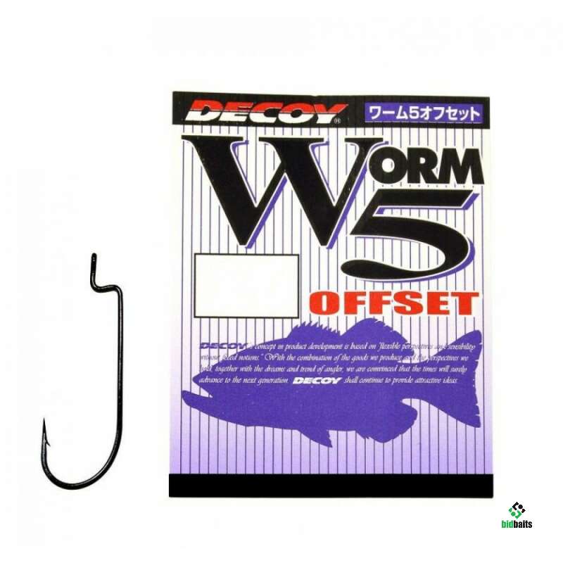 Decoy Worm 5 Offset - офсетные крючки классической формы. Имеют прямое и немного удлиненное цевье. Изготовитель данной серии разрабатывал их для использования совместно с такими прогонистыми и не объёмными приманками как черви, слаги, твистера. Наличие широкого модельного ряда крючков, дает возможность оснастить силиконовую приманку достаточно большой длины. Качество Decoy Worm 5 Offset находится на самом высоком уровне.