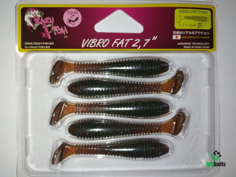 Crazy Fish Vibro Fat — виброхвост для ловли щуки, судака, окуня и сома. Благодаря вырезам на теле он идеально подходит для оснащения офсетными крючками и ловли в трудных местах. Также на теле приманки есть отверстия для оснащения вольфрамовыми или свинцовыми гвоздиками, что поможет раскрыть потенциал приманки в большей степени! Силиконовая приманка имеет довольно большой и тяжёлый хвост, благодаря чему активно играет на любой скорости проводки и соблазняет рыбу с большого расстояния.