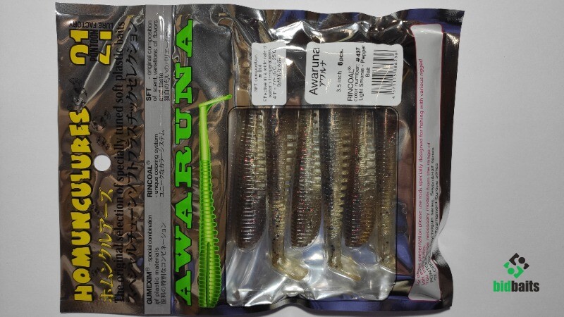Виброхвосты Awaruna изготовлены из мягкого износоустойчивого пластика Gumexim с добавлением фирменного аттрактанта Homunculures-SFT. Приманка имеет очень интересную конструктивную особенность: в теле приманки, строго по центру, расположено отверстие, позволяющее идеально ровно насаживать ее на джиг-головку или двойник. Небольшой паз на спине позволяет прятать в него жало офсетного крючка, тем самым превращая приманку практически в "незацепляйку".