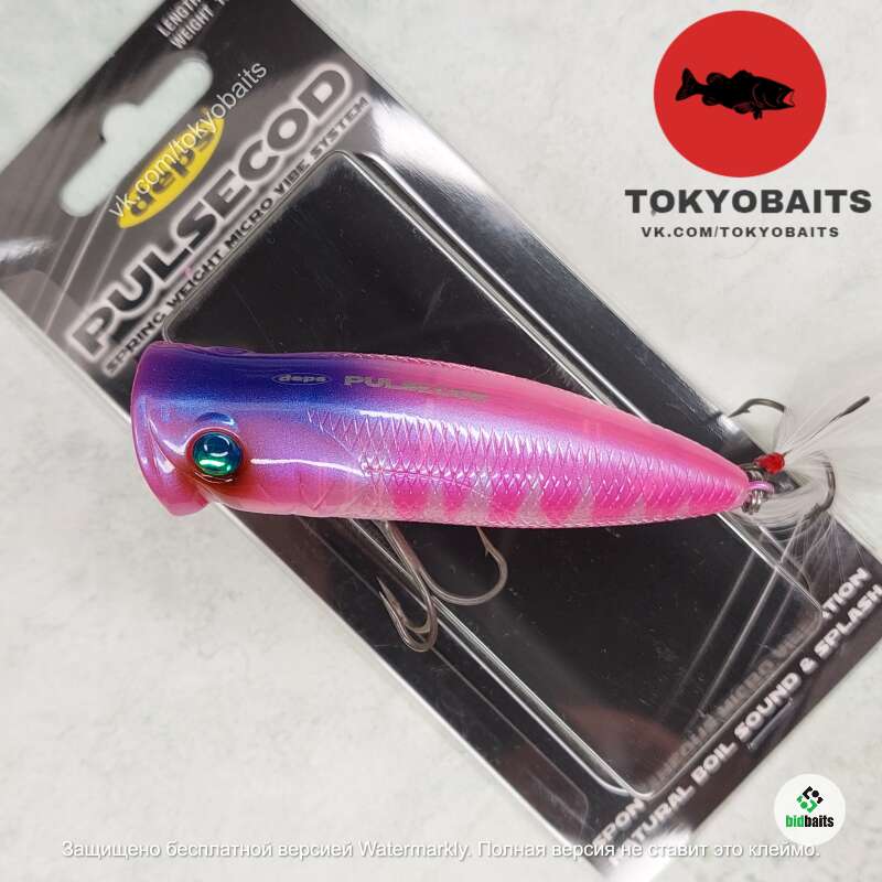 Воблер Pulsecod - поппер от компании Deps. Область применения его - это в основном ловля у поверхности воды на неглубоких, заросших травой водоемах, или же просто в верхних слоях воды. Отличительной чертой во внешнем облике Pulsecod является большая лобовая часть. Звуки, издаваемые им на рывках, очень интересные. В головной части находится пружина с шариком, и воблер продолжает вибрировать при остановках. Габариты этого поппера довольно внушительные, что предполагает работу не только по окуню, например, но и по щуке. У воблера Pulsecod внутренняя оригинальная система балансировки, благодаря чему воблер на паузах ведет себя очень заманчиво для рыбы, образуя колебания определенной амплитуды и ритма.
