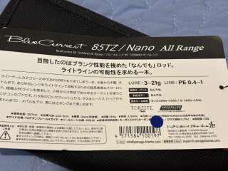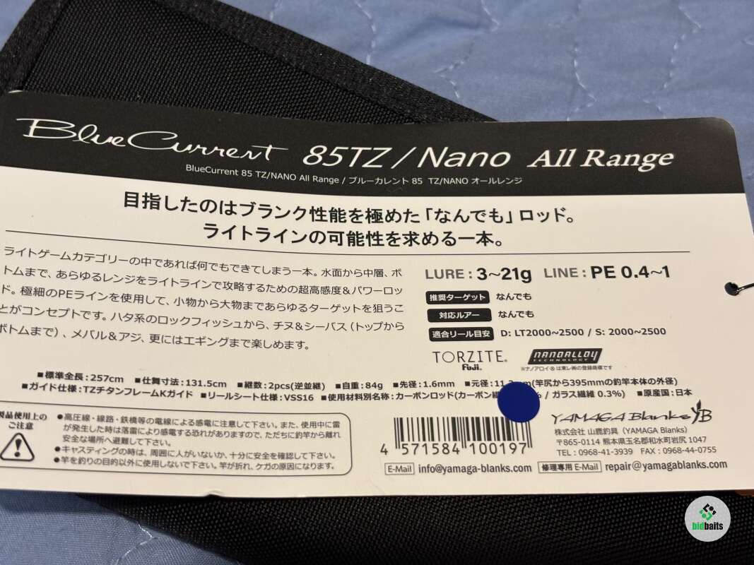 Blue Current TZ BLC-85/TZ Nano All-Range –Знаменитая линейка Blue Current от японского концерна Yamaga Blanks. Удилище позиционируется как «All-Range», то есть подходящее к приманкам любого типа: будь то воблеры, джиг или блесна. Бланк BLC-85/TZ максимально разгружен кольцами Fuji Torzite K-series в титановой оправе увеличенного диаметра, которые в свою очередь повышают дальность заброса и облегчают ловлю рыбы при отрицательных температурах воздуха. Бланк удилища выполнен по новой технологии Nanoalloy, которая позволяет значительно повысить прочность и жесткость удилища, не увеличивая вес, в следствии чего мы получаем спиннинг, способный просечь костистую пасть трофейной рыбы на самом выбросе, но при этом легкий и чуствительный, не вызывающий дискомфортных ощущений в руке после продолжительной ловли. Тестовый диапазон спиннига 3-21 позволяет полностью перекрыть спектр приманок, используемый при ловле как на средней, так и на сверхдальней дистанции, а строй удилища позволяет производить активную анимацию приманок удилищем - будь-то джиг или воблер минноу.