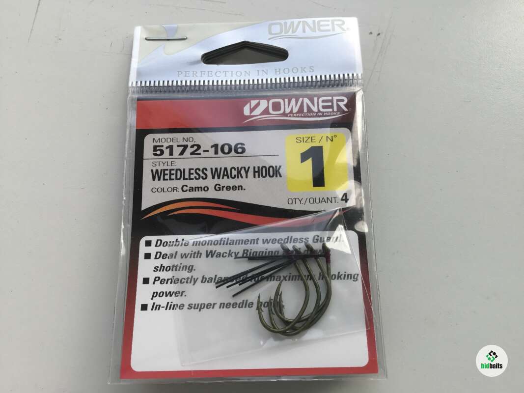 Owner/C’ultiva 5172 Wacky Weedless Hook – специальный крючок для монтажа «вэки». Имеет защиту жала от подводной растительности и мусора в виде двух нейлоновых усов. Такой монтаж популярен в бассовой ловле. Мягкая силиконовая приманка, как правило, червь, реже слаг или виброхвост, крепится посередине тела.