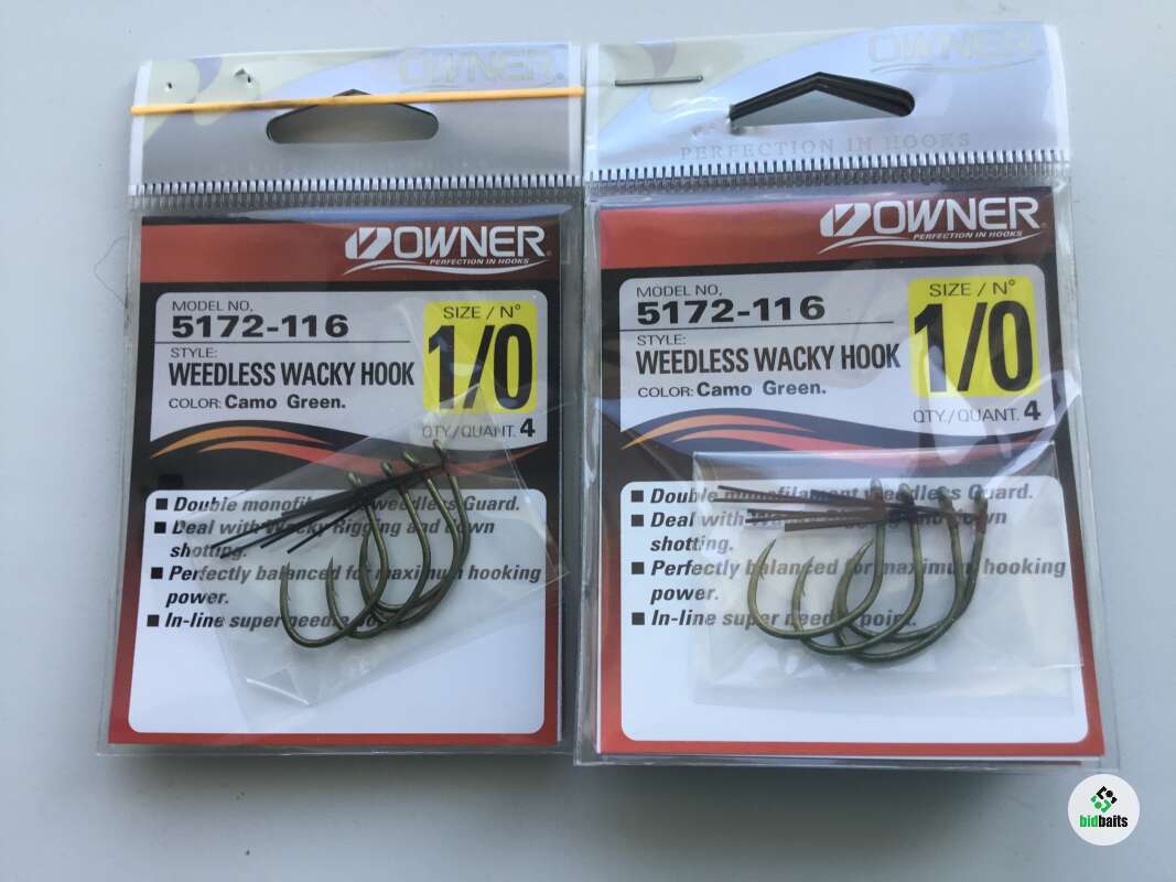 Owner/C’ultiva 5172 Wacky Weedless Hook – специальный крючок для монтажа «вэки». Имеет защиту жала от подводной растительности и мусора в виде двух нейлоновых усов. Такой монтаж популярен в бассовой ловле. Мягкая силиконовая приманка, как правило, червь, реже слаг или виброхвост, крепится посередине тела.