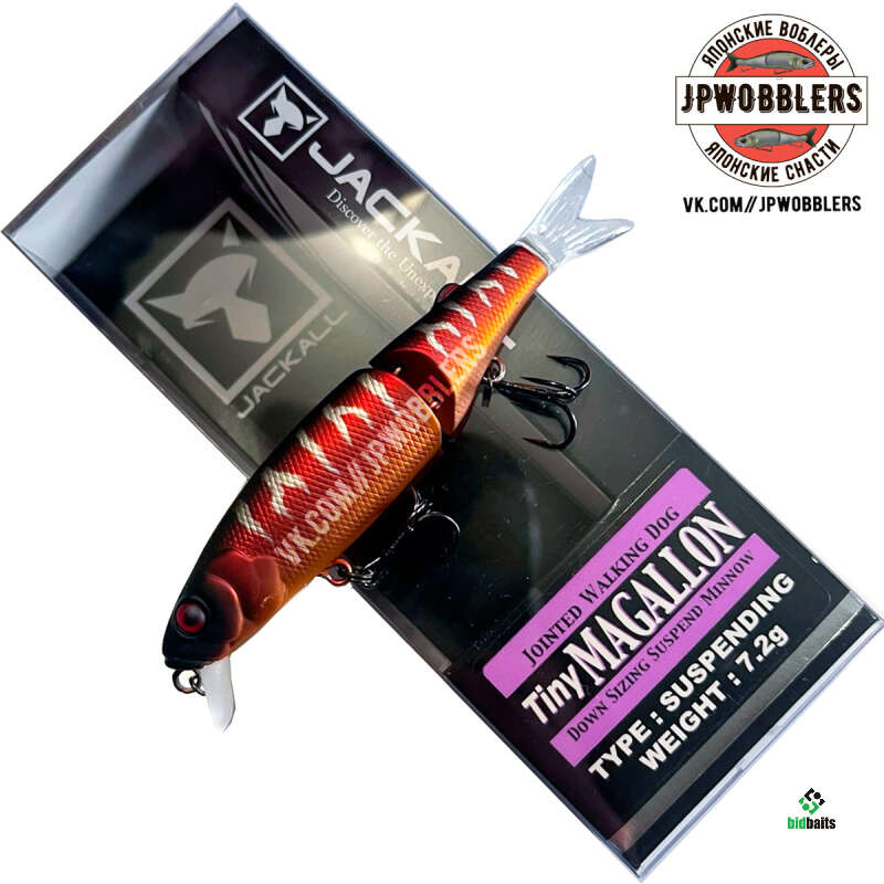 Воблер серии Tiny Magallon от торговой марки Jackall представляет собой компактную версию популярной модели Magallon. Это двухсоставной воблер типа минноу, его рабочий горизонт находится в пределах от 0,5 до 0,8 м. Тип плавучести этой приманки - suspending, поэтому воблер может долгое время зависать в толще воды. Подвижный силиконовый хвостик добавляет приманке сходства с настоящей рыбкой, дополнительно провоцируя хищника. Tiny Magallon выпускается как в натуральных, так и в кислотных расцветках. Оснащается воблер парой тройных крючков. Приманка от Jackall подходит для ловли окуней, жерехов, голавлей, щук и прочих крупных хищников. Наиболее эффективной проводкой будет равномерка или твичинг.