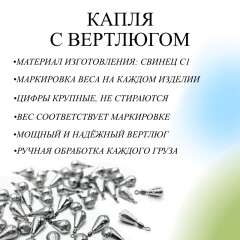 Каждый груз имеет четкую маркировку, с цифрами тиснением во внутрь. Для изготовления грузил используется качественный вертлюг, который не разлетится при забросе. Упаковка по 10 шт в прочный пакет. Все пакеты запаяны, что гарантирует доставку грузил в заявленном количестве. Так же мы можем собрать заказ в индивидуальном количестве, пишите в сообщения.