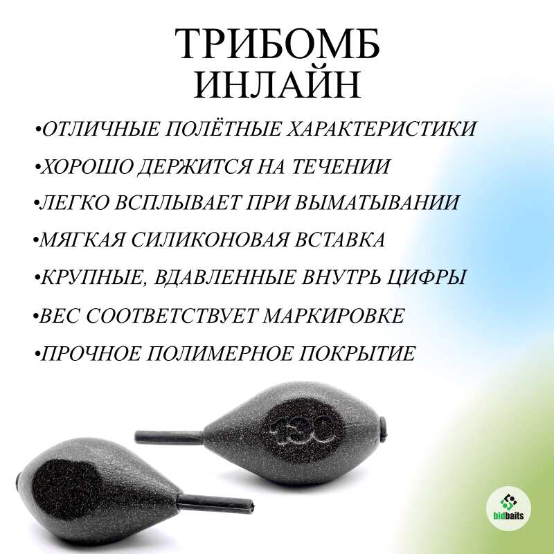 Грузило Трибомб инлайн - это груз с округлёнными гранями, со смещённой вперёд массой для устойчивости в полёте и лучшей фиксации на дне. Форма груза позволяет делать более точные и дальние забросы Грузило трибомб инлайн выполнено из качественного сырья, имеет прочное порошковое покрытие. Краска на данном грузе имеет легкую шероховатость. Не блестит на солнце. Цвет рыболовного грузила гармонично сочетается с любым типом грунта. Набор грузил трибомб инлайн упакован в прочный пакет, что обеспечивает сохранность груза. Мы рекомендуем подбирать карповые грузила по весу, исходя из условий лова, глубины, течения, структуры дна.