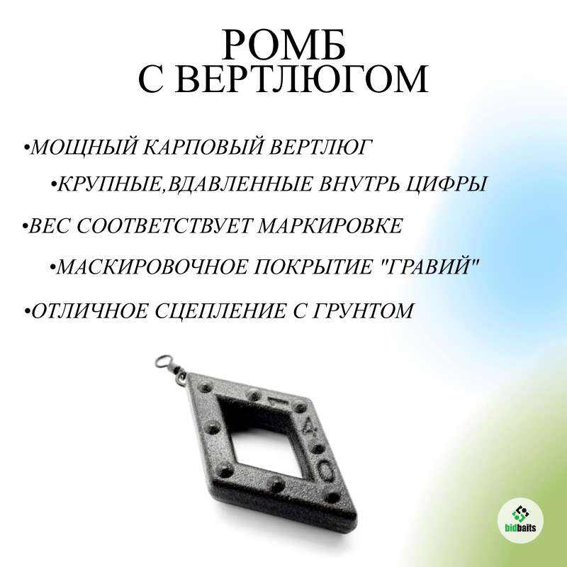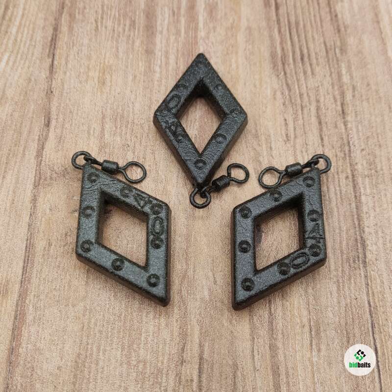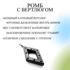Грузило ромб - это грузило ромбовидной формы с мощным карповым вертлюгом. Груз ромб изготовлен из свинца. Данное грузило применяется при донной ловле, грузик хорошо держится на сильном течении. Такой вид груза подойдет для оснащения донки, фидера, закидушки. Ромб с вертлюгом можно использовать вместо фидерной кормушки. Так же эти грузила используют в карповой рыбалке, на ровне с гриппой, горизонтом, элеватором и другими грузами. Донные грузила выполнена из качественного сырья, имеют прочное порошковое покрытие. Краска на грузиле имеет легкую шероховатость. Не блестит на солнце. Цвет данного груза гармонично сочетается с любым типом грунта. Набор грузил упакован в прочный пакет.