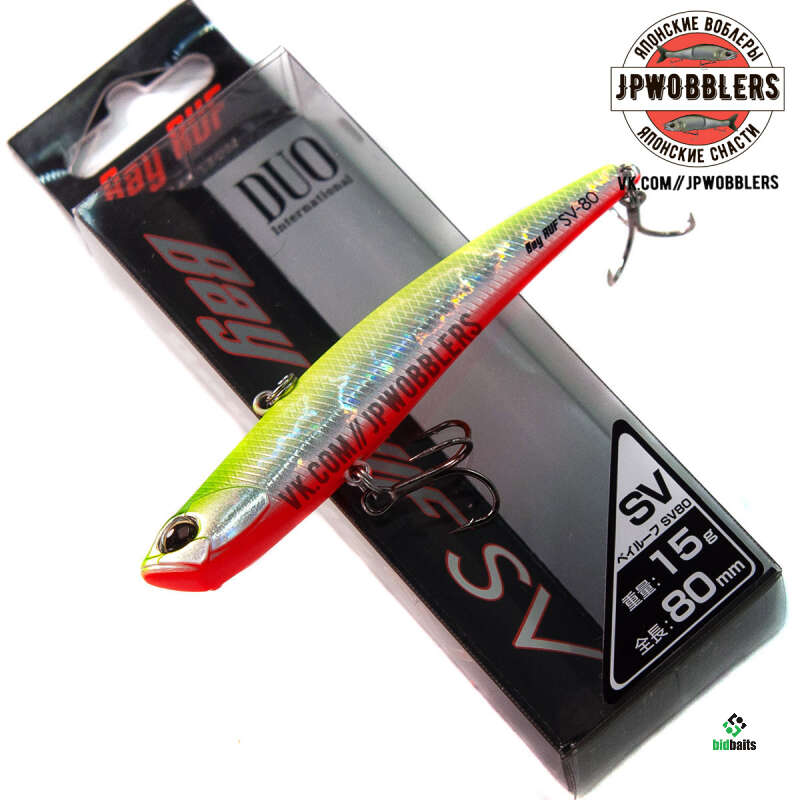 Одной из очень удачных и уловистых приманок фирмы является воблер DUO Bay Ruf SV-80. Эта наживка относится к семейству Vib воблеров. Модель этого волкера, как в принципе и все "Вибы", идеально показывают себя при ловле хищников на глубоких местах или сильном течении. Это обуславливается прогонистым телом приманки с достаточно большим ее удельным весом. Не исключением стал и воблер DUO Bay Ruf SV-80. Имея длину тела в 80 мм и вес 15 гр, этот тонущий виб оказался весьма эффективным.