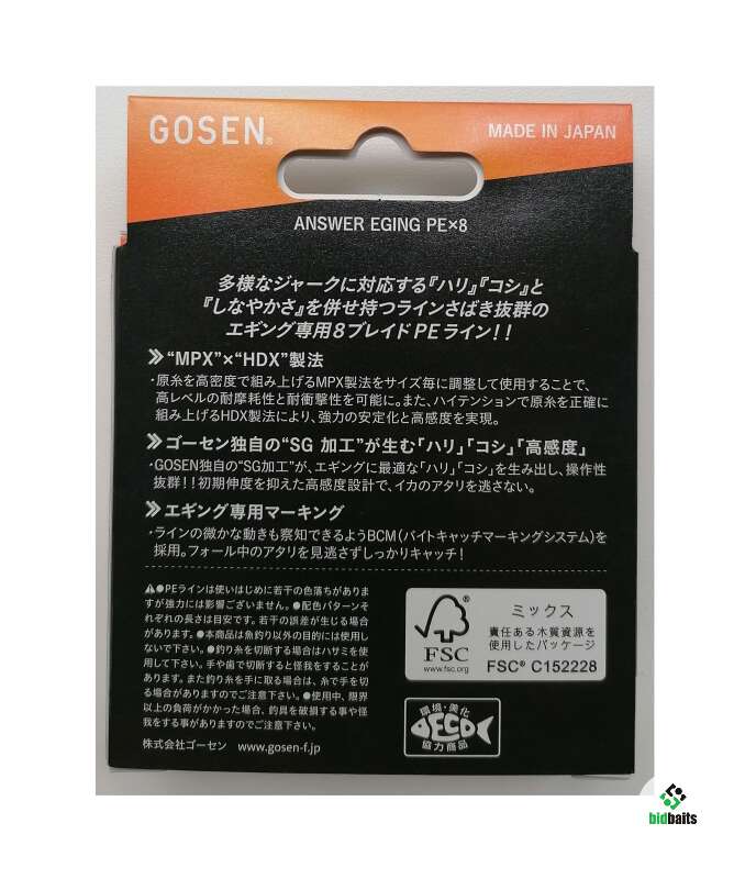 Оригинал. Япония. 8-ми жильный плетёный шнур GOSEN ANSWER EGING PE X8, толщина # 0.8, разрывная нагрузка 7.3 кг (16 lb), размотка 200m, цвет белый с маркировкой. Каждые 150см маркировка. Цвет маркировки: желтый 30см, по краям маркировки синие вставки по 10 см. В изготовлении применяются новые технологии GOSEN - "MPX" x "HDX" manufacturing method и обработка SG. Используется уникальная система маркировки шнура - Bite Catch Marking System, это позволит увидеть даже незначительные колебания лески.