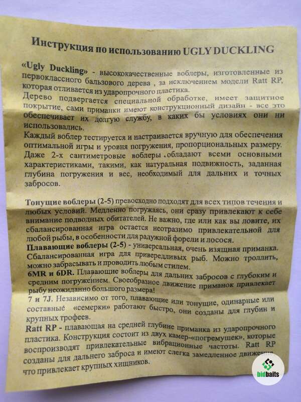 Воблеры Ugly Duckling известны рыболовам всего мира тем, что все они исключительно ручной работы. Никакой автоматизации процесса производства, каждая приманка собрана из высокопрочной бальсы, окрашена и лакирована вручную. Каждый воблер тестируется в специальном бассейне, что полностью исключает возможность появления на прилавках неработающих приманок. При разработке своих приманок специалисты компании Ugly Duckling делают упор именно на те места, в которых они рыбачат – никаких заморских рек, наполненных арапаймой или тарпоном или морских глубин, только европейские реки! А поскольку в большинстве своем европейские реки мало отличаются от наших, воблеры Ugly Duckling великолепно ловят рыбу в больших и малых реках стран СНГ, не пасуют они и перед стоячими водоемами. Воблеры Ugly Duckling отличаются тем, что «заточены» под речную ловлю, стабильно работают и не сбиваются даже при проводке против сильного течения , что делает их незаменимым инструментом при ловле крупных речных хищников – щуки, судака, жереха, форели, окуня