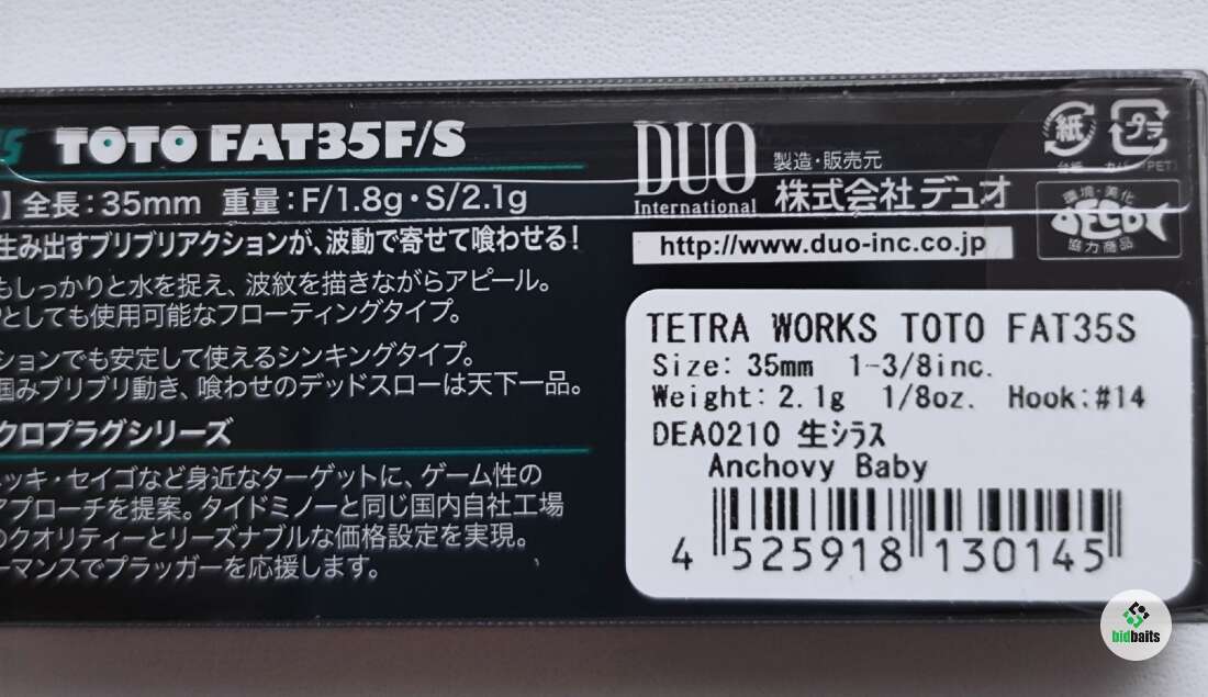 DUO Tetra Works Toto Fat 35S - новинка от японской компании DUO. Микро-воблер немного превосходящий свой вес благодаря продуманному дизайну. Два фиксированных стальных груза обеспечивают этому воблеру отличную балансировку и производительность. Маленький корпус приманки рассчитан на быстрые проводки, но и при медленных проводках приманка ведет себя также стабильно. В наших условиях Toto Fat35S прекрасно ловит белого хищника и другую речную рыбу.