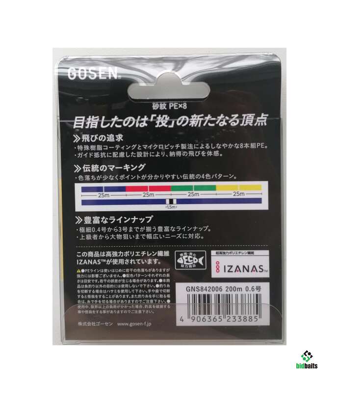 8-х жильный со специальным полимерным покрытием плетёный шнур GOSEN SAMON SURF CASTING PE 8 BRAID LINE # 0.6 (max 6.4kg) размотка 200m, 4-х цветный, каждые 25м (синий, красный, зелёный, жёлтый). Применёна новая технология изготовления- micro-pitch manufacturing method. Благодаря этой технологии шнур имеет эластичность, повышенную дальность заброса и износостойкость. Выпускается с апреля 2020г.
