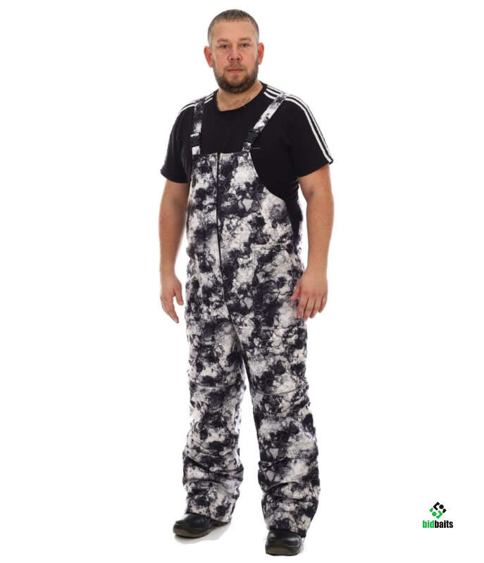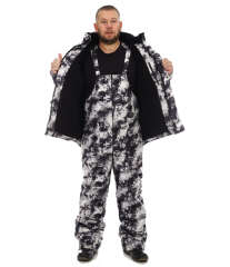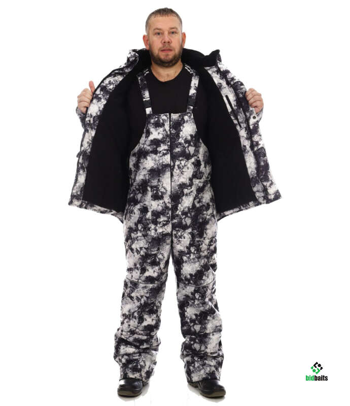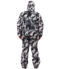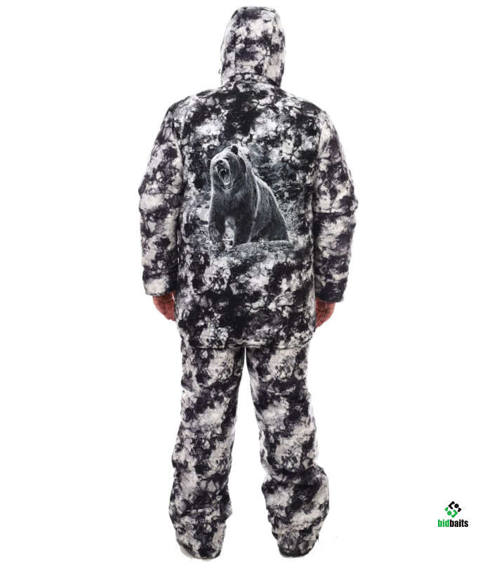 Зимний мужской костюм Медведь из мембранной не шуршащей ткани 5000/5000 с рисунком медведя на спине, камуфляжной белой расцветки. Утеплитель Слайтекс, в куртке плотность 350 гр./кв.м., в полукомбинезоне 200 гр./кв.м., подкладка на флисе. Мембранная ткань не шуршит, бархатистая на ощупь, может использоваться как рыболовный костюм, так и для охоты.