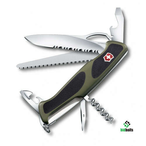 Нож перочинный VICTORINOX RangerGrip 179, 130 мм, 12 функций, фиксатор лезвия "liner lock", серейторное лезвие с петлёй для открывания 1 рукой, рукоять из зелёного нейлона с чёрными вставками.