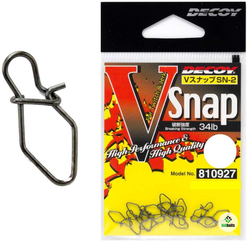 Decoy V-Snap – застежка-карабин, специально спроектированный для приманок, требующих рывковую проводку, особенно воблеров с нейтральной плавучестью. Благодаря тонкой проволоке и, следовательно, малому весу, застежки - не нарушается балансировка даже идеально выверенных «суспендеров», а специальная, немного угловатая форма позволяет достичь высокой прочности.