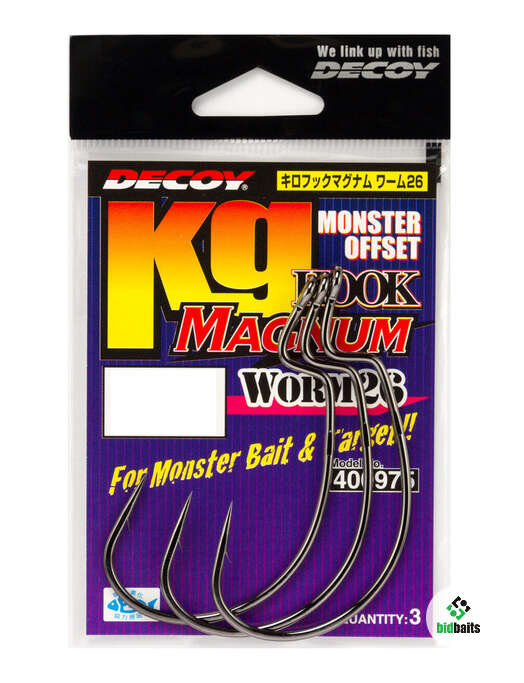 DECOY KG HOOK MAGNUM WORM26 — серия очень крупных офсетных крючков, предназначенных для оснащения больших силиконовых приманок. Их характерной особенностью является глубокий поддев и жало, расположенное выше относительно ступеньки цевья. Такая форма крючка позволяет оснащать им крупные силиконовые приманки с объемным телом.