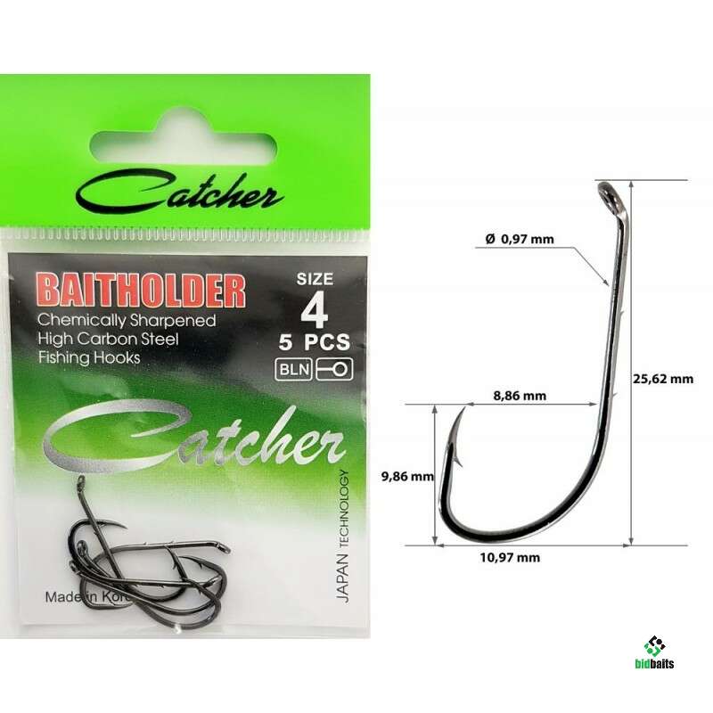 Одинарный крючок Baitholder CATCHER пригодится рыболовам, которые планируют охоту за крупной рыбой. Этот мощный крючок усилен с помощью двух дополнительных насечек на цевье. Baitholder CATCHER способен справиться с сомом или солидным представителем семейства карповых.
