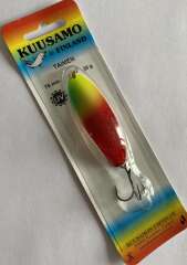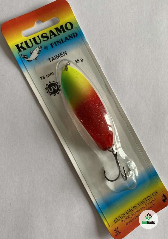 KUUSAMO TAIMEN — колеблющаяся блесна, разработанная для ловли форели и кумжи. Применяют ее как для ловли в заброс, так и в качестве троллинговой приманки. Она показывает высокие результаты как на течении, так и в спокойной воде. В нашей стране помимо лососевых этими блеснами успешно ловят жереха, судака, щуку и крупного окуня. TAIMEN имеет сильно изогнутый силуэт. Верхняя часть приманки значительно шире и тяжелее нижней. Такая геометрия блесны придает ей широкую и динамичную игру. Проводить TAIMEN следует равномерной проводкой. Рекомендуется также делать паузы в проводке, во время которых блесна планирует, аппетитно покачивая боками. Именно во время паузы очень часто случаются поклевки. KUUSAMO TAIMEN производится в размере 75 мм и имеет массу 25 г.