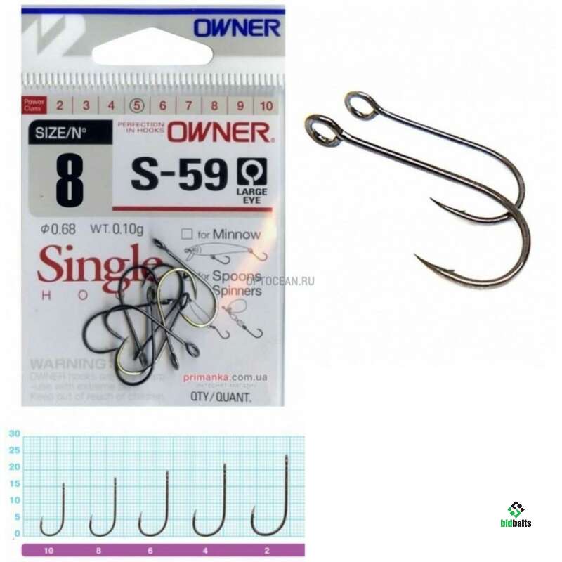 Серию крючков OWNER 51580 (S-59) рекомендуется использовать при оснащении блесен и различных типов воблеров, в том числе и минноу. Крючки характеризуются удлиненным цевьем, полукруглым загибом и удлиненным жалом. Данная серия крючков часто используются в дорогих японских воблерах и блеснах, легкого и ультра-легкого класса. Главное их отличие от обычных одинарных крючков – это большое широкое ушко для крепления к приманке через заводное кольцо.