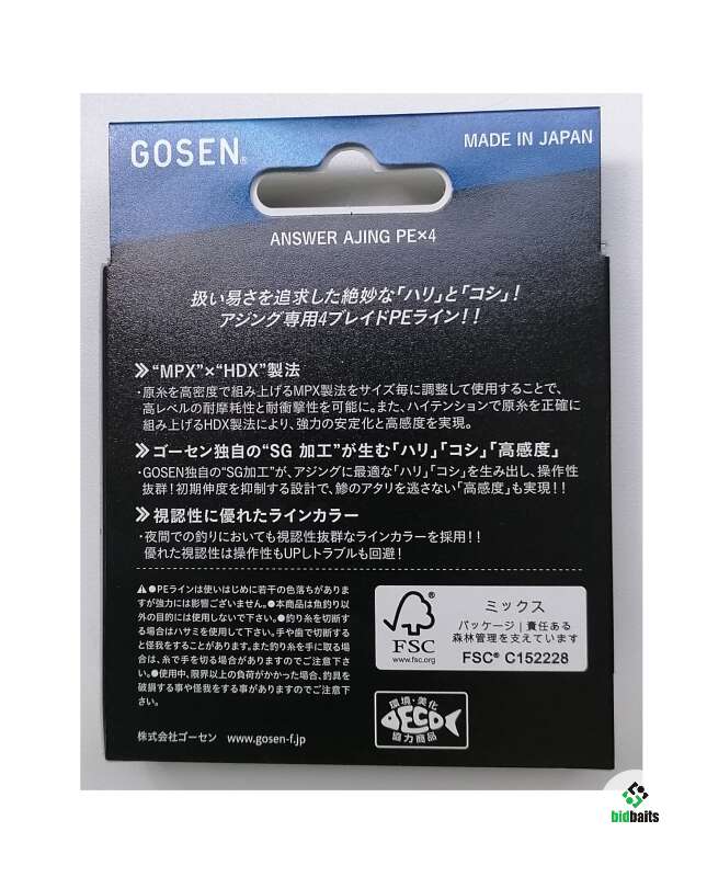 В изготовлении применяются новые технологии GOSEN - "MPX" x "HDX" manufacturing method и обработка смолой GOSEN с силиконовым покрытием. Шнур заменил TINY PE AJI.