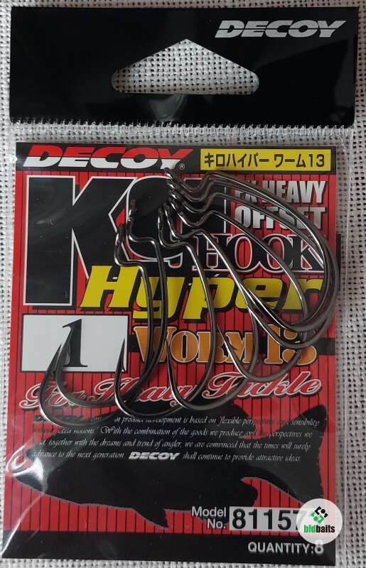 Удлиненное и мощное жало офсетного крючка Decoy KG Hyper Worm 13 направлено в сторону ушка. Это обеспечивает идеальное закрепление приманки, которая полностью скрывает снасть от глаз рыбы и одновременно не дает зацепиться за траву или коряги на дне водоема. Круглая форма снасти, в отличие от классического варианта, дает возможность работать не только с длинными насадками, но и с округлыми. Особенно удачным выглядит сочетание с объемной искусственной рыбкой Keitech FAT Swing Impact.