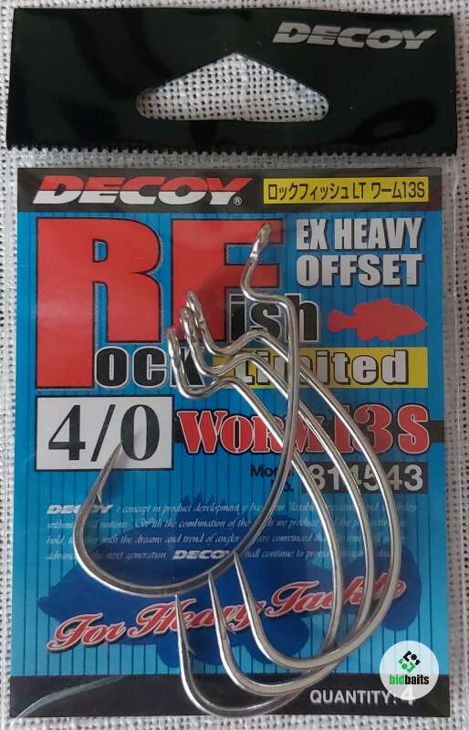 Офсетный крючок Decoy Rock Fish Limited Worm 13S имеет особую конструкцию: жало направлено строго в сторону ушка крючка. Это дает возможность располагать крючок наиболее плотно на силиконовой приманке, что почти исключает вероятность возникновения зацепов при ее соприкосновении с различными препятствиями. В случае наличия у приманки специальной канавки для офсетного крючка (как на спине у некоторых моделей приманок Keitech) - она может стать даже полностью незацепляемой. Данная особенность делает эту модель почти незаменимой в случае совершения ловли в очень труднодоступных зонах из-за наличия подводного хлама, коряг и других особенностей рельефа.