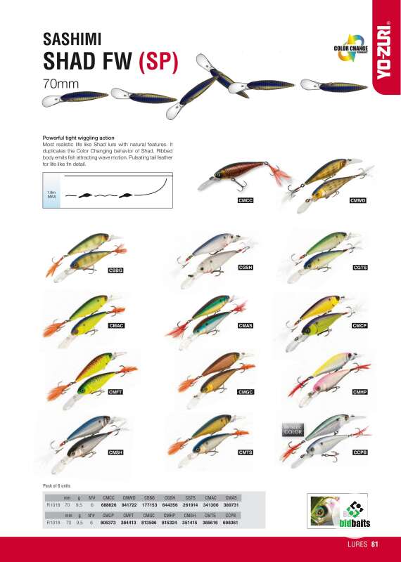 Внутри корпуса Sashimi Shad FW 70SP: в хвосте, по центру и в головной части установлены балансировочные шарики. Потому воблер стабилен при любой проводке. Соблазнительно колеблется на равномерке, рыскает на твиче. На паузе в анимации зависает неподвижно, чтобы даже неактивная рыба получила время решиться на атаку. Дополнительно конструкторы оснастили Sashimi R1018 погремушкой из маленьких дробинок. А хвостовой тройник замаскировали мушкой. Глубоководная приманка Shad FW 70SP в первую очередь рассчитана на зубастую щуку, а также судака. Возможны поклевки и горбача-окуня.
