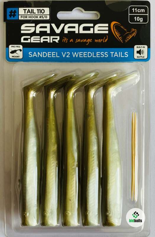 Savage Gear LB Sandeel V2 Weedless Tail - мягкие приманки имитации песчанки типа "виброхвост", специально разработанные для оснащения офсетными крючками. Специальные слоты на брюшке и спинке приманки позволят вам правильно разместить крючок. Приманка великолепно работает по морскому окуню, треске, сайде и другим морским хищникам при их ловле спиннинговой снастью с катеров, набережных и пирсов. Благодаря прогонистой форме тела, выполненного из высококачественного силикона она хорошо играет даже на замедленной равномерной проводке. Помимо морской рыбы приманка Savage Gear Sandeel V2 WL Tail 110 хорошо привлекает пресноводных хищников - например, среднего и трофейного размера щуку и судака.