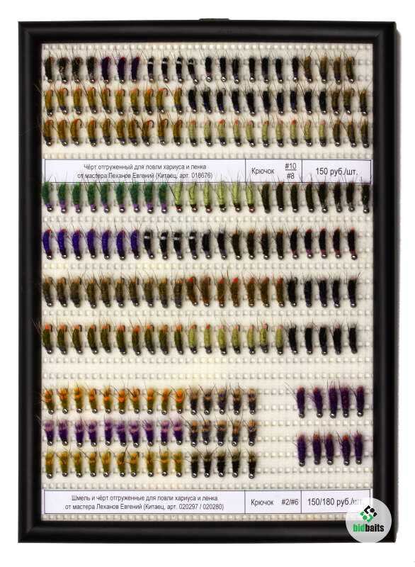 Мушки (их ещё называют черти) отгруженные - готовые искусственные приманки для ловли достаточно крупных речных хищников (хариуса, ленка). Изготавливаются гуру данного направления - известный мастер Китаец. Он был одним из первопроходцев и до сих пор оттачивает своё мастерство и ищет варианты по улучшению уловистости своих изделий.