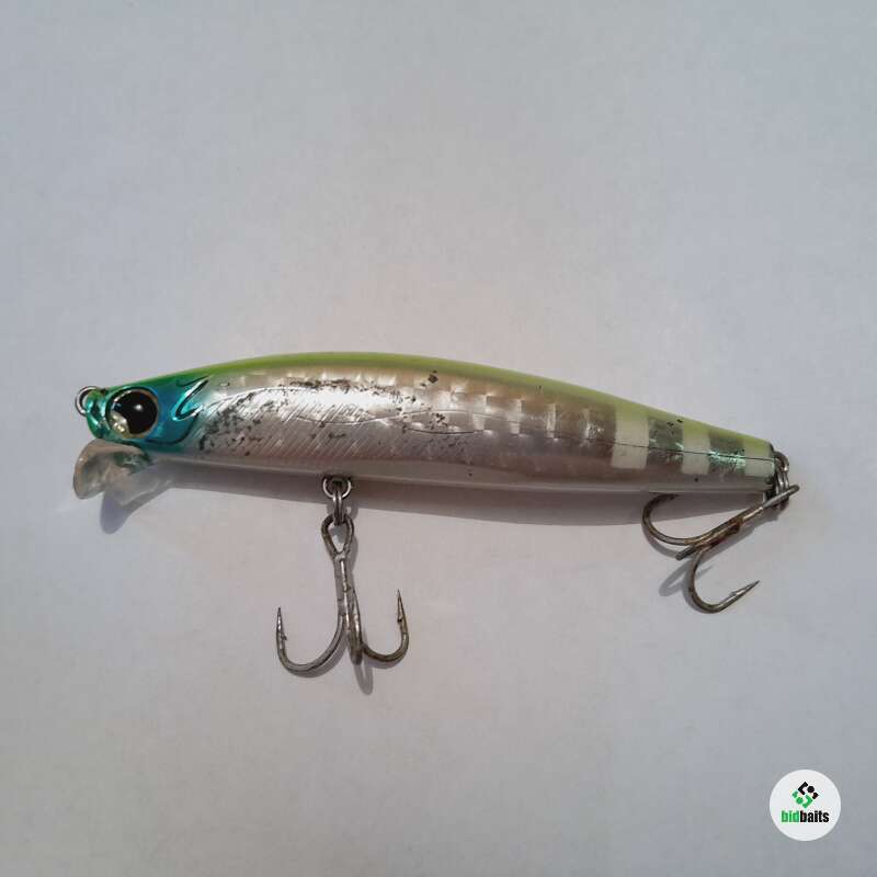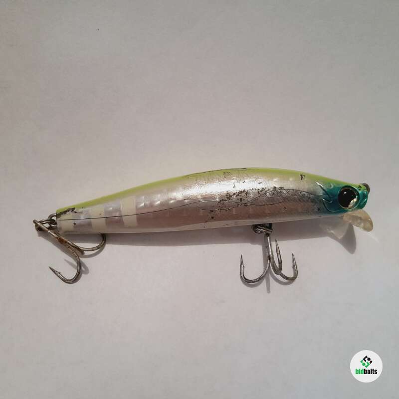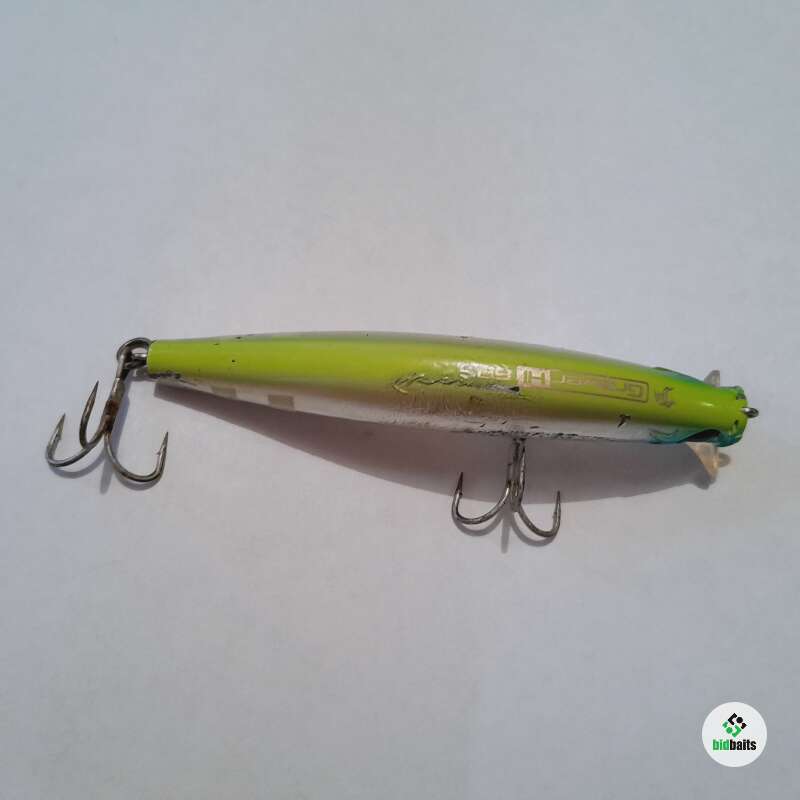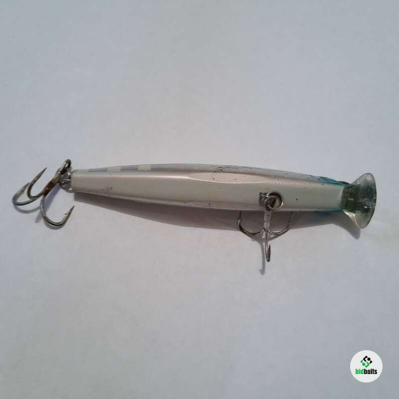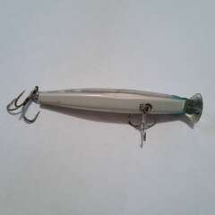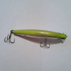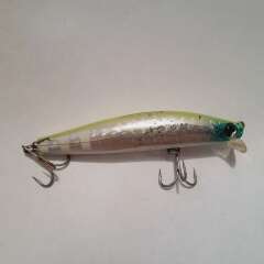 Тонущий воблер с системой дальнего заброса 89мм, 15гр. Состояние хорошее, есть многочисленные сколы и небольшое коробление лакокрасочного покрытия.