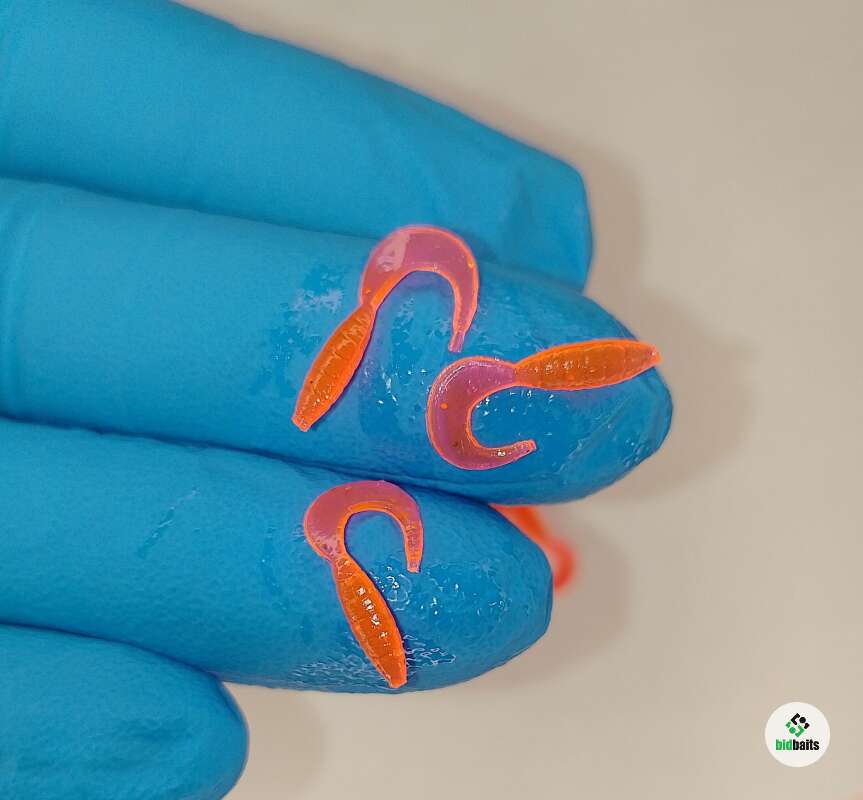 Приманки из готовленны из мягкого силикона твердостью 6 шор, с добавлением активного аттрактанта **Мотыль**