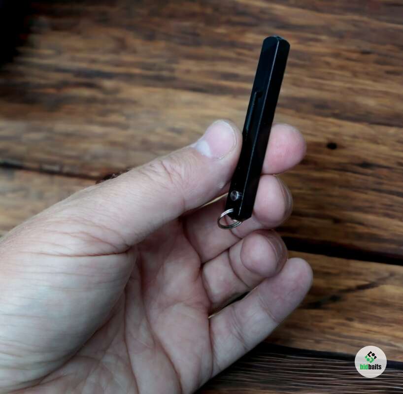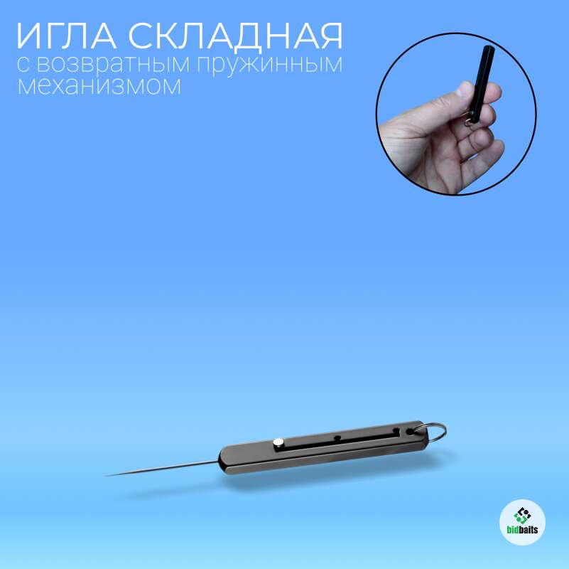 Игла складная (мини шило) с возвратным пружинным механизмом. Инструмент, которого часто очень не хватает на рыбалке в случаях, когда требуется распутать узел или очистиь отверстие в ушке крючка, а также во множестве других ситуаций. Все элементы выполнены из металла. Длина изделия в сложенном виде 60 мм, в выдвинутом 83 либо 102 мм. Оснащена заводным кольцом для крепления на связке ключей, карабине или т.п.