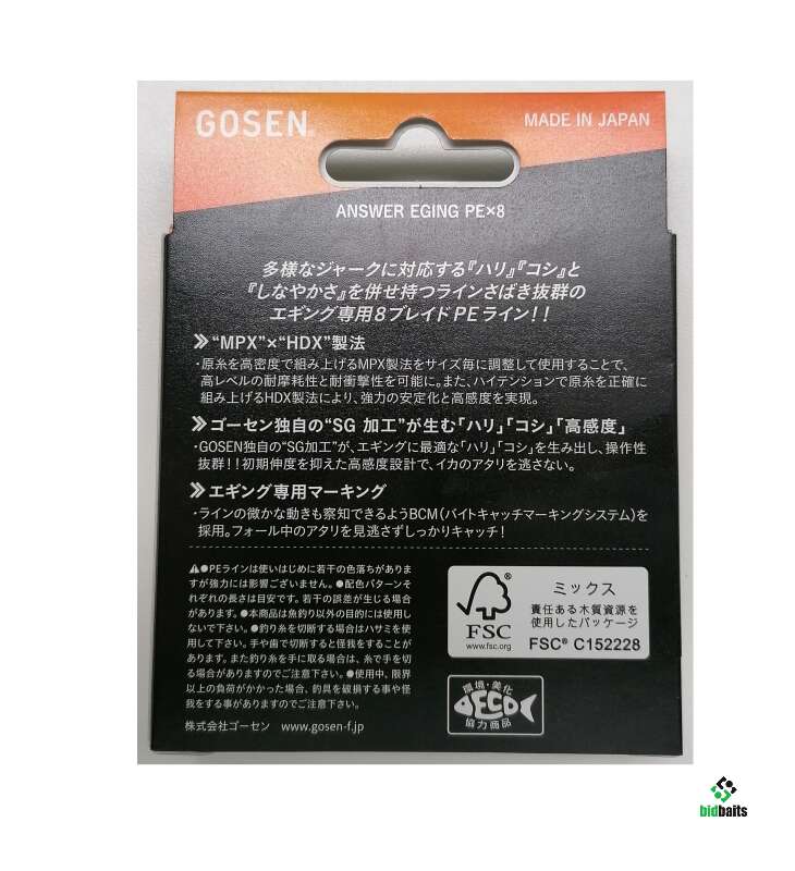 8-ми жильный плетёный шнур GOSEN ANSWER EGING PE X8, толщина # 0.5, разрывная нагрузка 5.4 кг (12 lb), размотка 200m, цвет белый с маркировкой. Каждые 150см маркировка. Цвет маркировки: желтый 30см, по краям маркировки синие вставки по 10 см. В изготовлении применяются новые технологии GOSEN - "MPX" x "HDX" manufacturing method и обработка SG. Используется уникальная система маркировки шнура - Bite Catch Marking System, это позволит увидеть даже незначительные колебания лески.