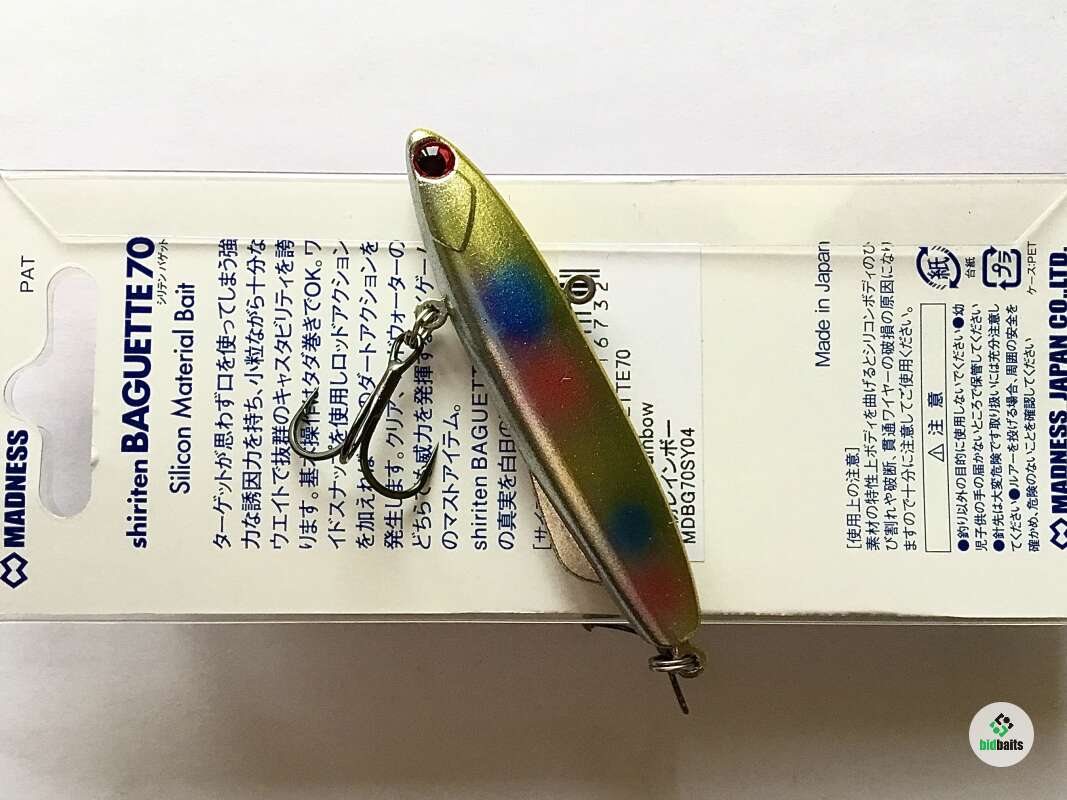 Вибы Madness Shiriten Baguette 70 - универсальные, всесезонные приманки для подледной рыбалки и ловли на спиннинг. Они изготовлены из эластичного силикона, а не пластика, как большинство объемных приманок. Материал при этом довольно прочный и выдерживает много поклевок. Роль огрузки выполняет металлический стержень внутри корпуса. Увесистый груз позволяет вибу погружаться на большие глубины и наделяет дальнобойностью. Эта приманка бесшумная. Она привлекает рыбу интенсивными вибрациями во время проводки. Baguette подходит для ловли щуки, крупного окуня, судака в любой сезон.