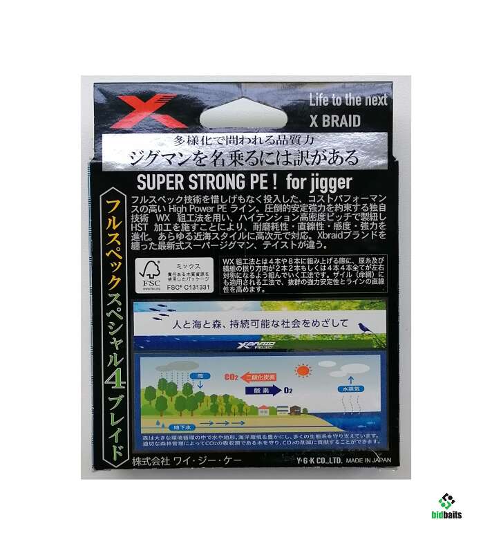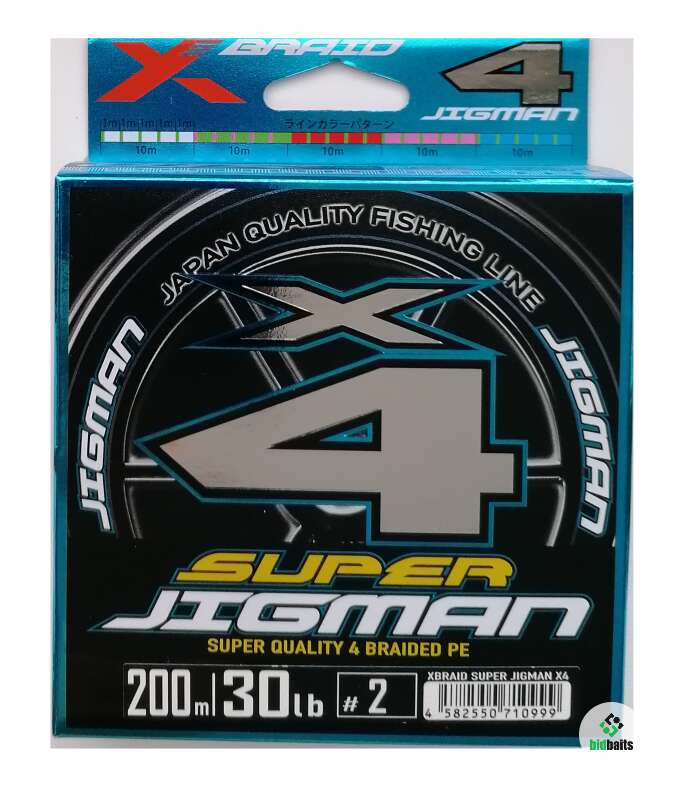 плетёный шнур YGK XBRAID SUPER JIGMAN X4, 4-х жильный, размотка 200m, толщина шнура #2, разрывная нагрузка 30lb (13,5 кг), пять цветов по 10м (фото).