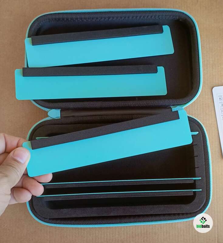 Корпус кошелька выполнен из жесткого карбона. Внутри имеются специальные вставки из EVA с пазами, куда вставляются кассеты. На планках наклеены полоcки из EVA, куда и размещаются блесны.