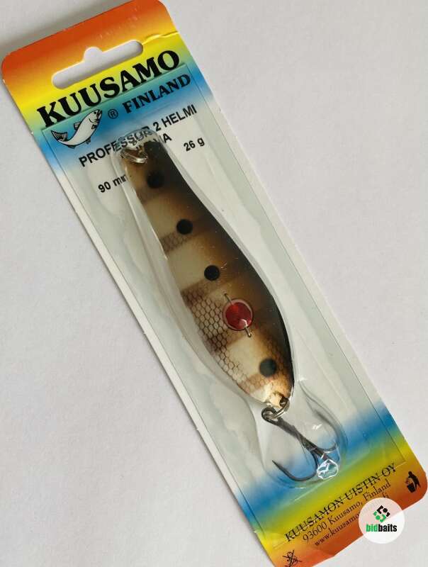 Блесна Kuusamo Professor 2, 90/26 (бусинка) - классическая универсальная приманка для ловли щуки, судака, форели и других рыб троллингом и в заброс. Является одной из старейших блесен фирмы Kuusamo.Посередине блесны, в круглом сквозном отверстии на проволоке, вставлен шарик-бусинка, имитирующий глаз рыбы. Грани бусинки переливаются под водой, отражая свет в разные стороны, что является для хищника дополнительным раздражителем и провоцирует тем самым на атаку.Приманка имеет один, но очень острый и надежный крючок-тройник и допускает проводку задом наперед, при перестановке крючка. Форма блесны типичная, похожа на плотву.Блесна с бусинкой наиболее эффективна при ловле в неглубоких водоемах с прозрачной водой.Выбирайте то, что проверено временем и неоднократно "одобрено" хищной рыбой.