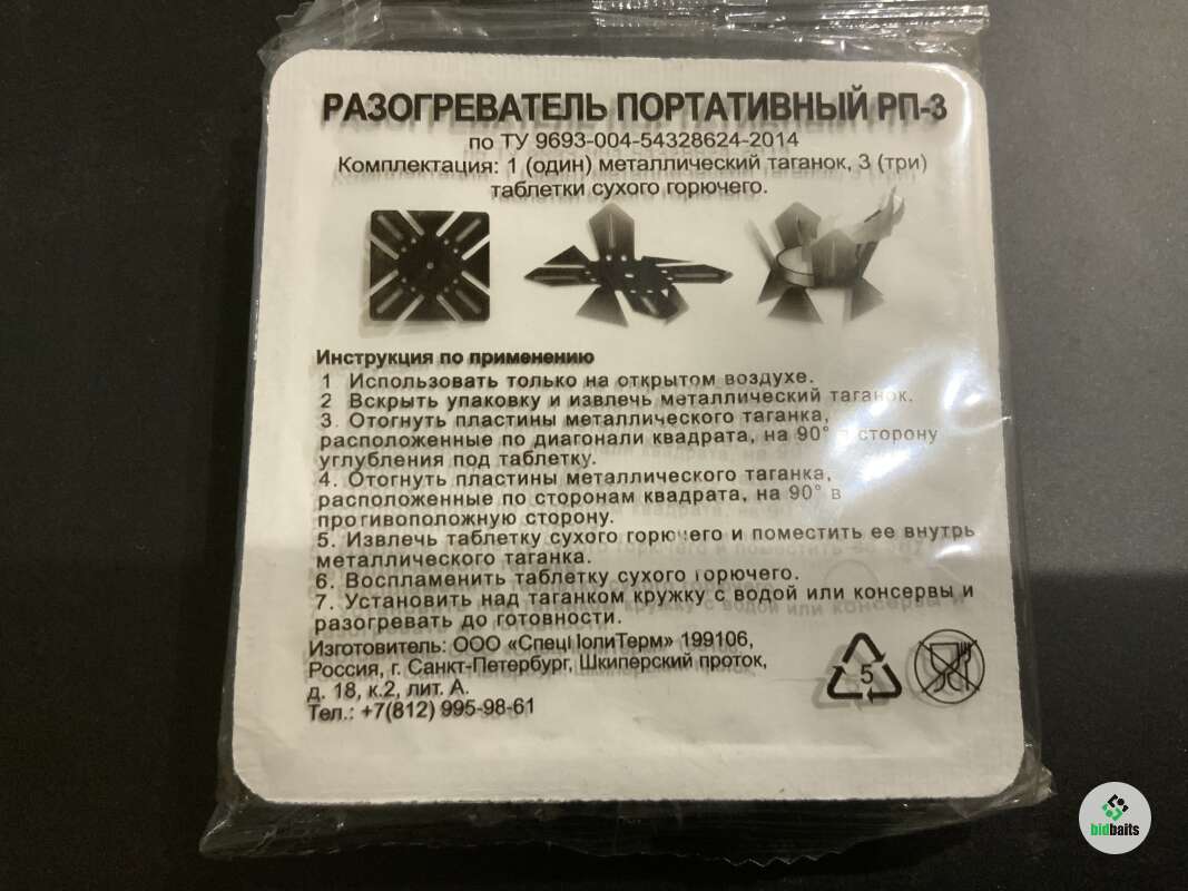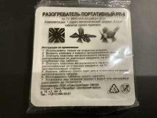 Разогреватель портативный РП-3. Комплектация - металлический таганок 1 шт., таблетки сухого горючего 3 шт. Служит для разогрева консервов и воды в кружке на открытом воздухе.