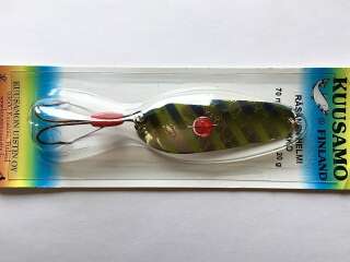 Блесна Kuusamo Rasanen 70/20(бусинка, незацеп.) - проверенная временем одна из самых уловистых блесен марки Kuusamo. Универсальна и применима для различных условий ловли. За счет объединения двух рабочих элементов разного типа, бусинки и крючка незацепляйки, выигрышно выделяется среди всех серий Rasanen 70/20.Бусинка, установленная в теле блесны, дрожа в воде и играя своими гранями на свету придает ей дополнительный привлекающий эффект, срабатывая как еще один раздражающий фактор для хищника.Особо прочный двойной крючок с металлическими усиками-отбойниками препятствует зацепу приманки за камни или водную растительность .